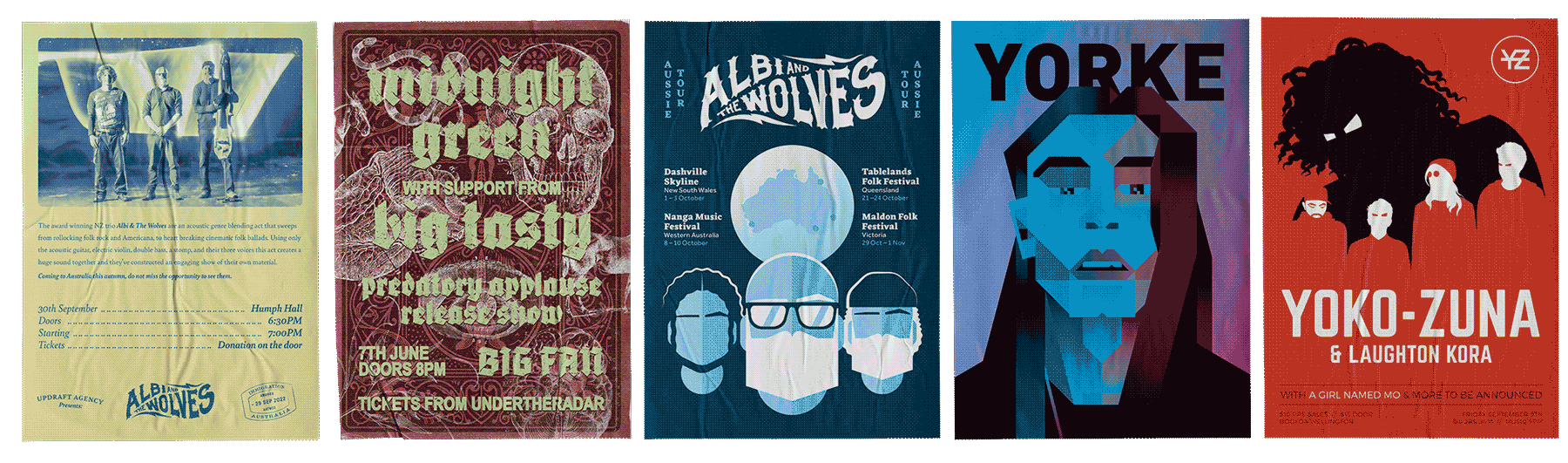 After years of being in a band, Iβve made my fair share of gig posters. Here are a few posters Iβve made for some of New Zealandβs super talented musicians.